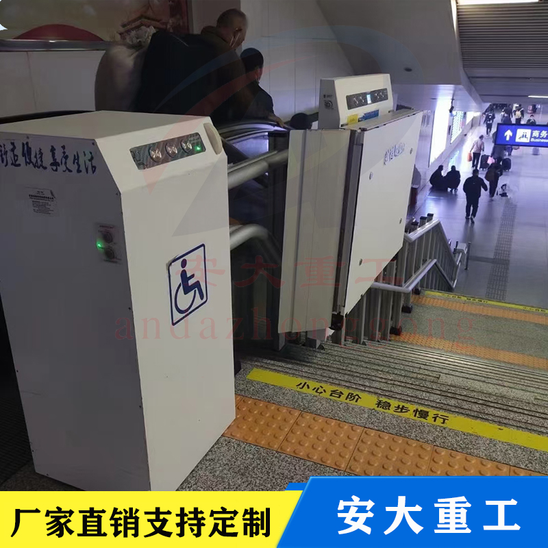 斜掛式無障礙升降平合按其運行方向分曲線型和直線型二種。直線型多采用齒輪齒條式驅動機構,沿樓梯做上升和下降,只能作直線運行不能轉彎,傾斜角一般不大于35度,適用于樓層較低、中間沒有水平段的直線型樓梯。曲線型采用繩球鏈式傳動,不僅能做上升和下降,還能水平、轉彎和螺旋形運行,適用范圍較為廣。該設備為乘坐輪椅的殘障人員上下樓梯提供了便利,現被廣乏地應用在家居住宅和公共場所的樓梯上